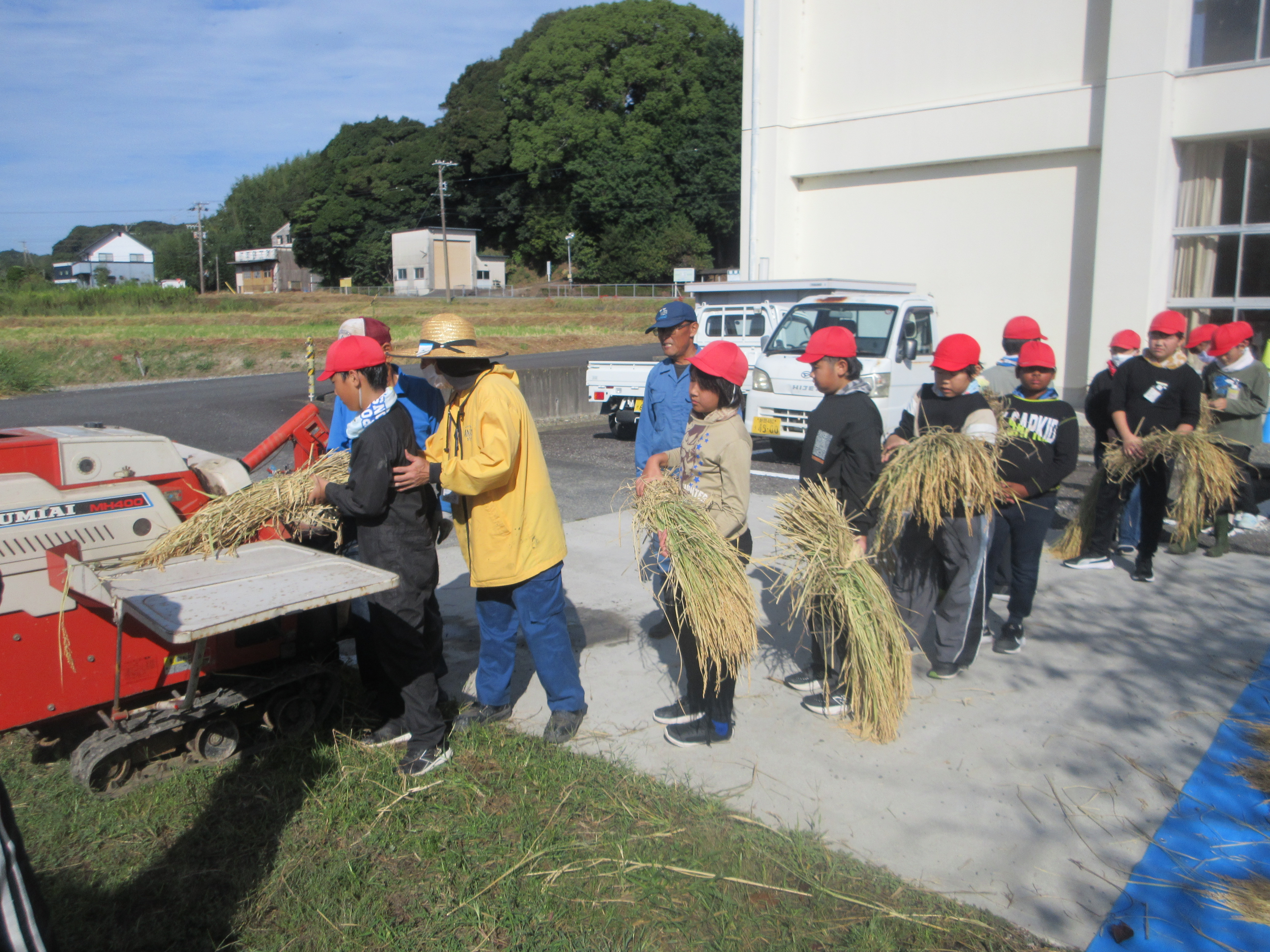 お米1つぶ1つぶが大事という声も聞かれ、束から落ちた稲穂をひろいあつめる姿も見られました。