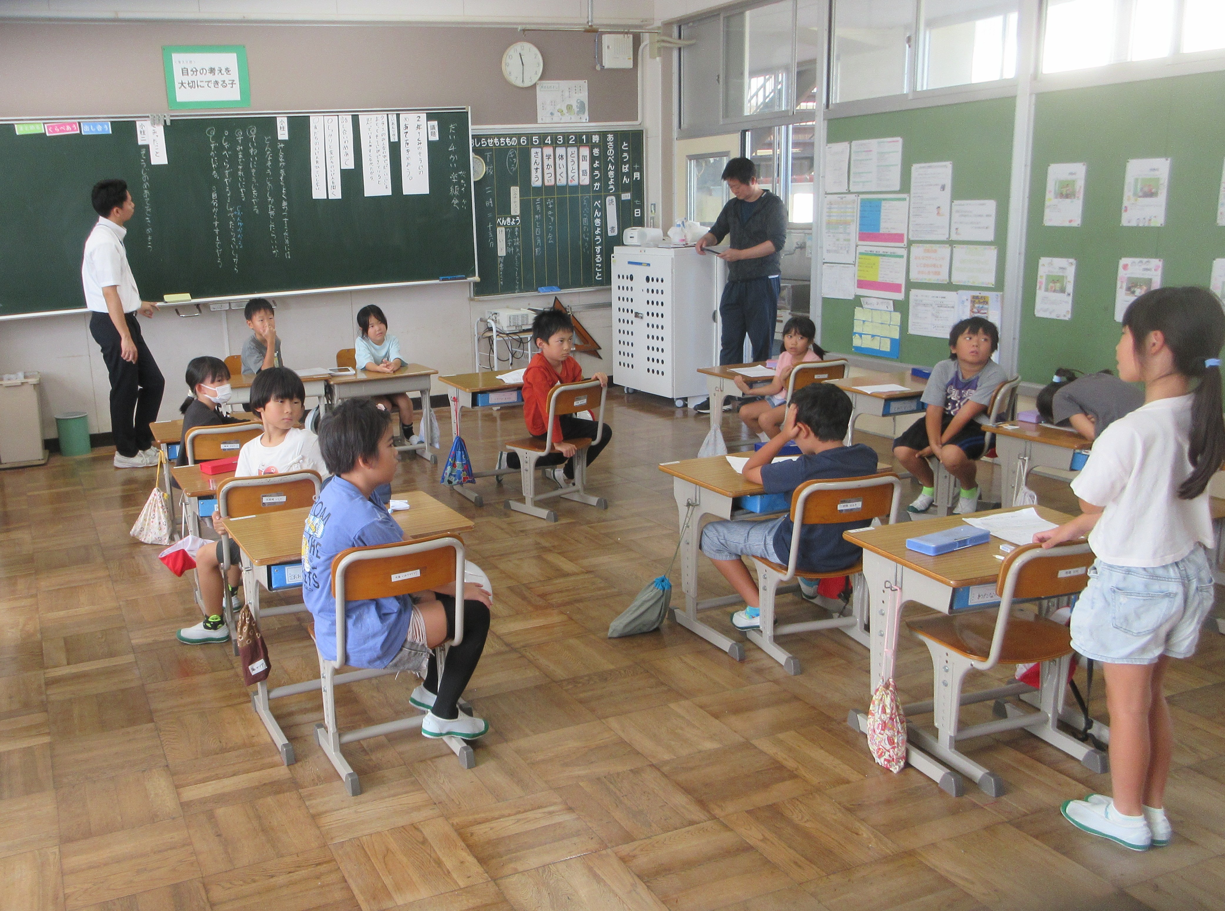 「2年1組のそうじのめあてを決めよう」という議題で話し合い活動を行いました。小柱1では「みんなで気持ちよく生活するためには、どんなそうじのしかたをしたらよいか」について、いろいろな意見が出されました。そうじの仕方について振り返り、学校ですすめている「だいじ」(だまって、いっしょうけんめい、じかんいっぱい)そうじを進めようと、たくさんの意見が出されました。