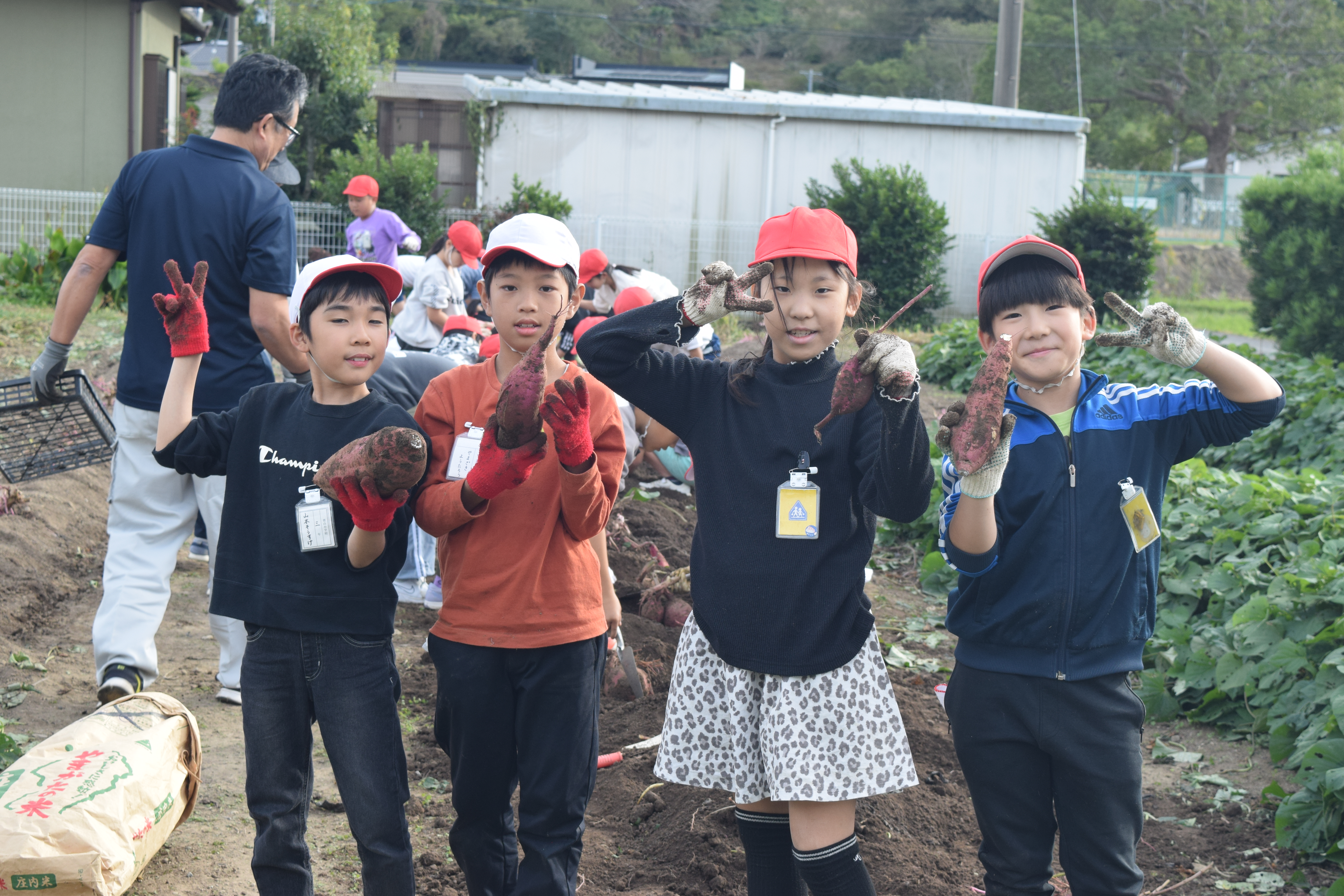 みんなにこにこ、楽しそう。収穫したおいもをどうするか相談ですね。楽しみです。