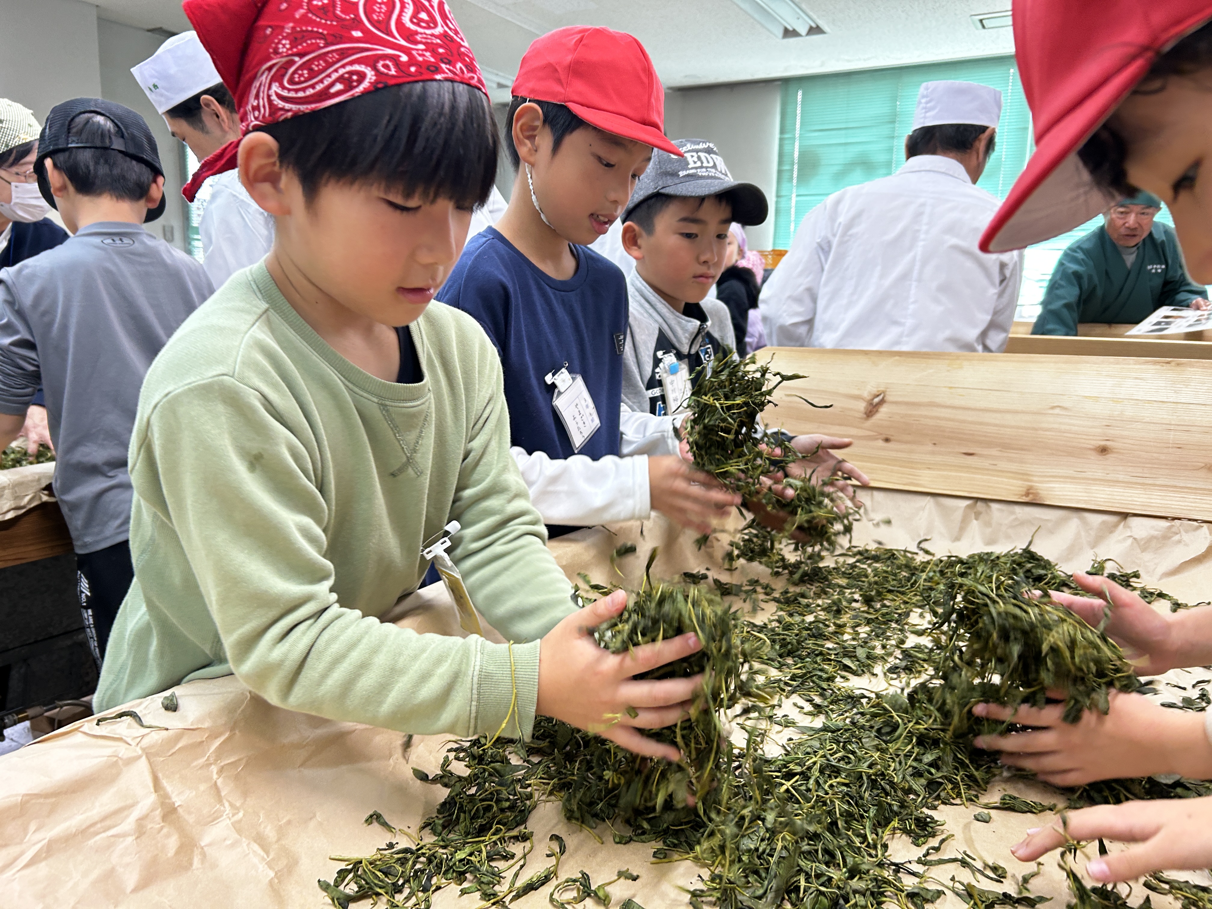 手もみの7つの工程を体験し「みんなで掛け声を合わせてお茶の塊を交換しながらやり楽しかった」「転がして力を入れるところがむずかしかった」「最初はべたべただったけど、最後はさらさらになっていった」「子供師匠って言ってもらえました。ありがとうございます」「上手にできて、うれしかった」などの感想が聞かれました。