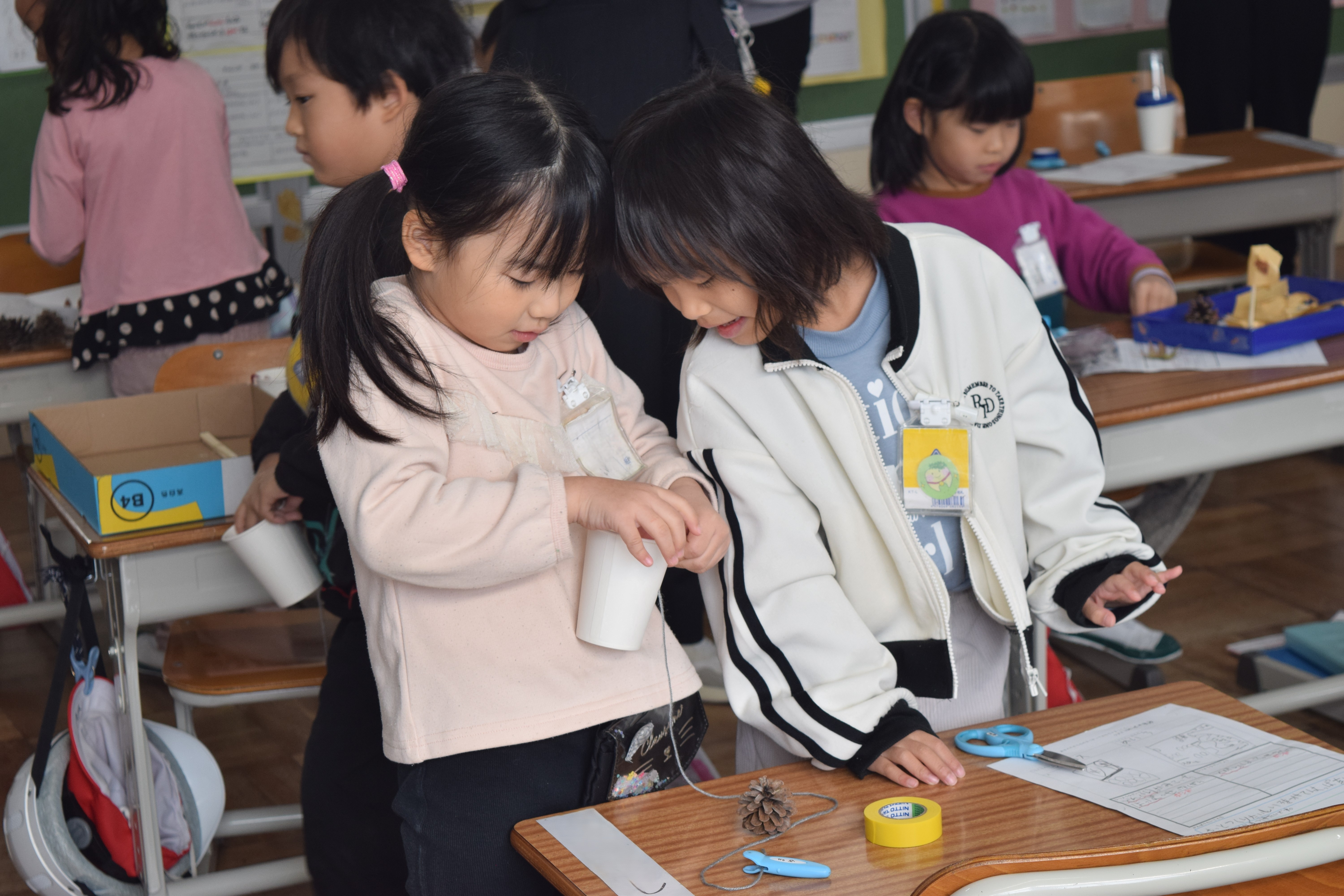 秋の自然のものを使っておもちゃ作りに挑戦してきました。今日は、困った点や改善点を出し合い、「強く」「楽しく」「かっこよく(かわいく)の視点から、おもちゃを改良することができました。黙々と制作活動に取り組んでは、友達同士かかわりあい、作ったものを見せ合い、実に楽しい時間となりました。
