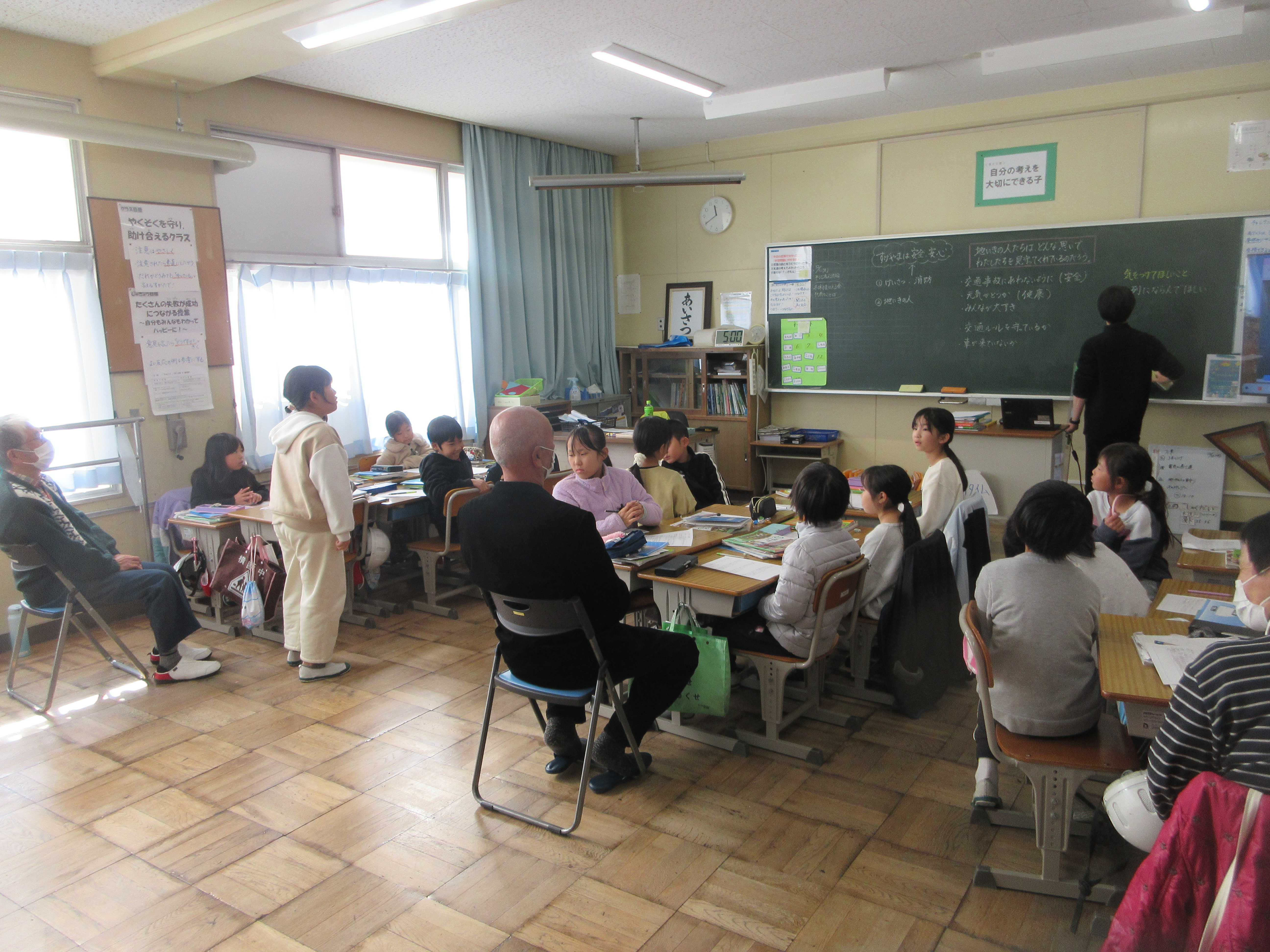 10日水曜日、3年生の社会科授業で、日頃、自分たちの登下校を見守ってくれる地域の方3名を招き、どんな思いでどんなことをしているか、子供たちのグループに入っていただきそれぞれお話を聞かせていただきました。