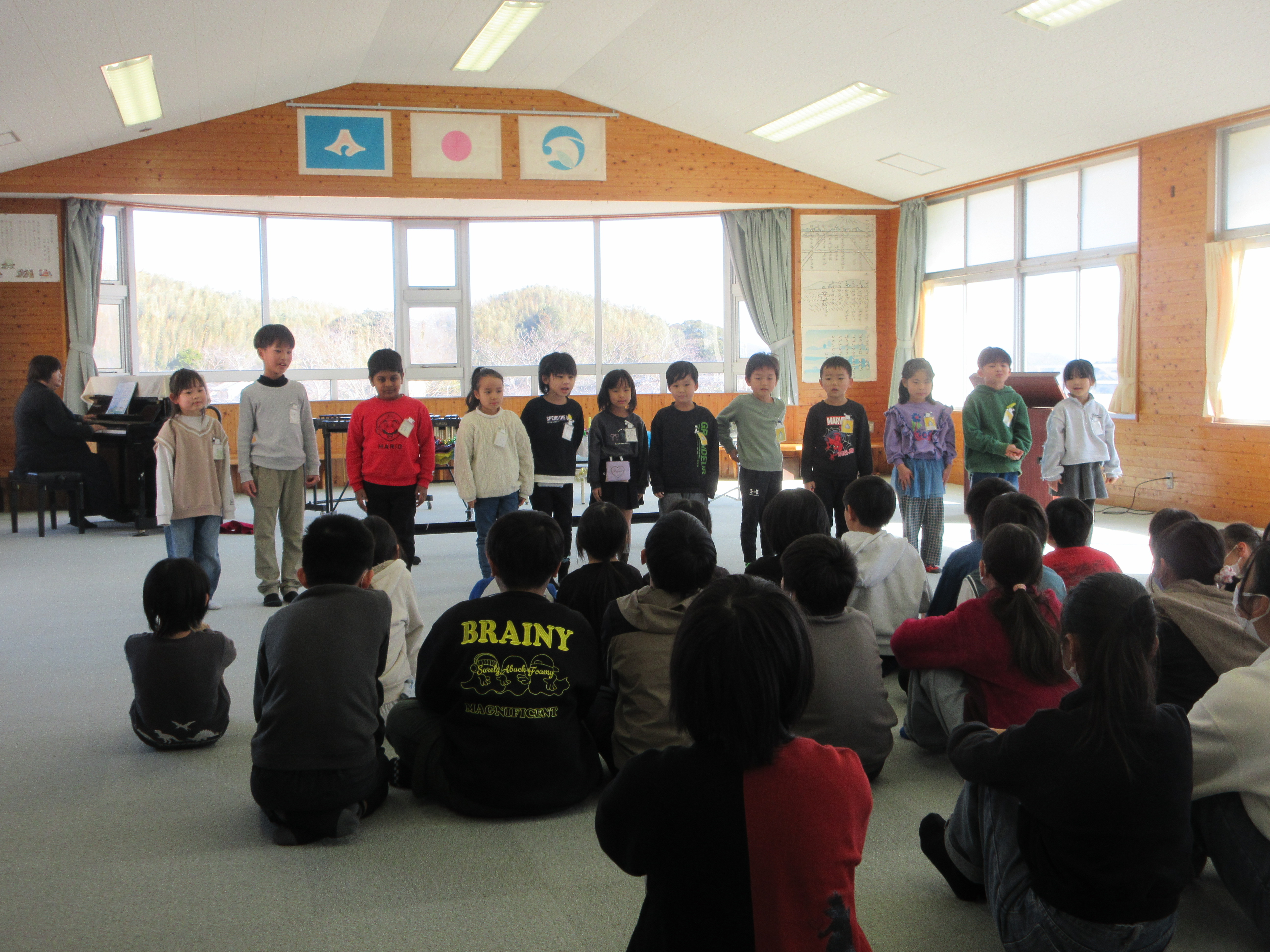 この写真は、1年生です。音楽授業で習った「やまびこさん」を歌い、1年生と見ている人と、1年生の言葉を繰り返し、やまびこのように呼びかけ合って実に楽しかったです。2番からは、1年生のオリジナル替え歌で、大変もりあがりました。