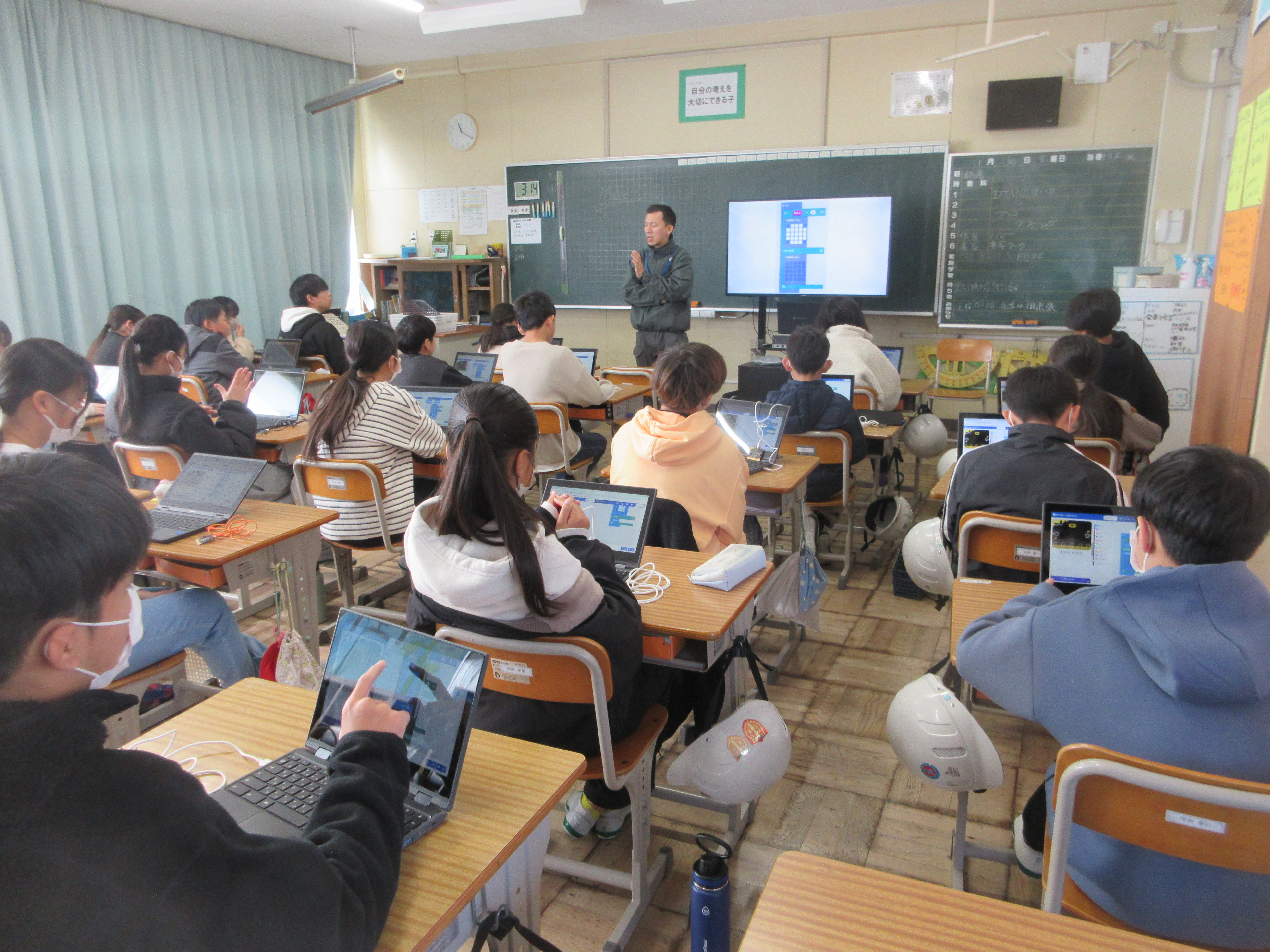 プログラミングでは、各自がプログラミングして、文字を出したりさいころを振ってその動きを見たり、その仕組みについて学びました。