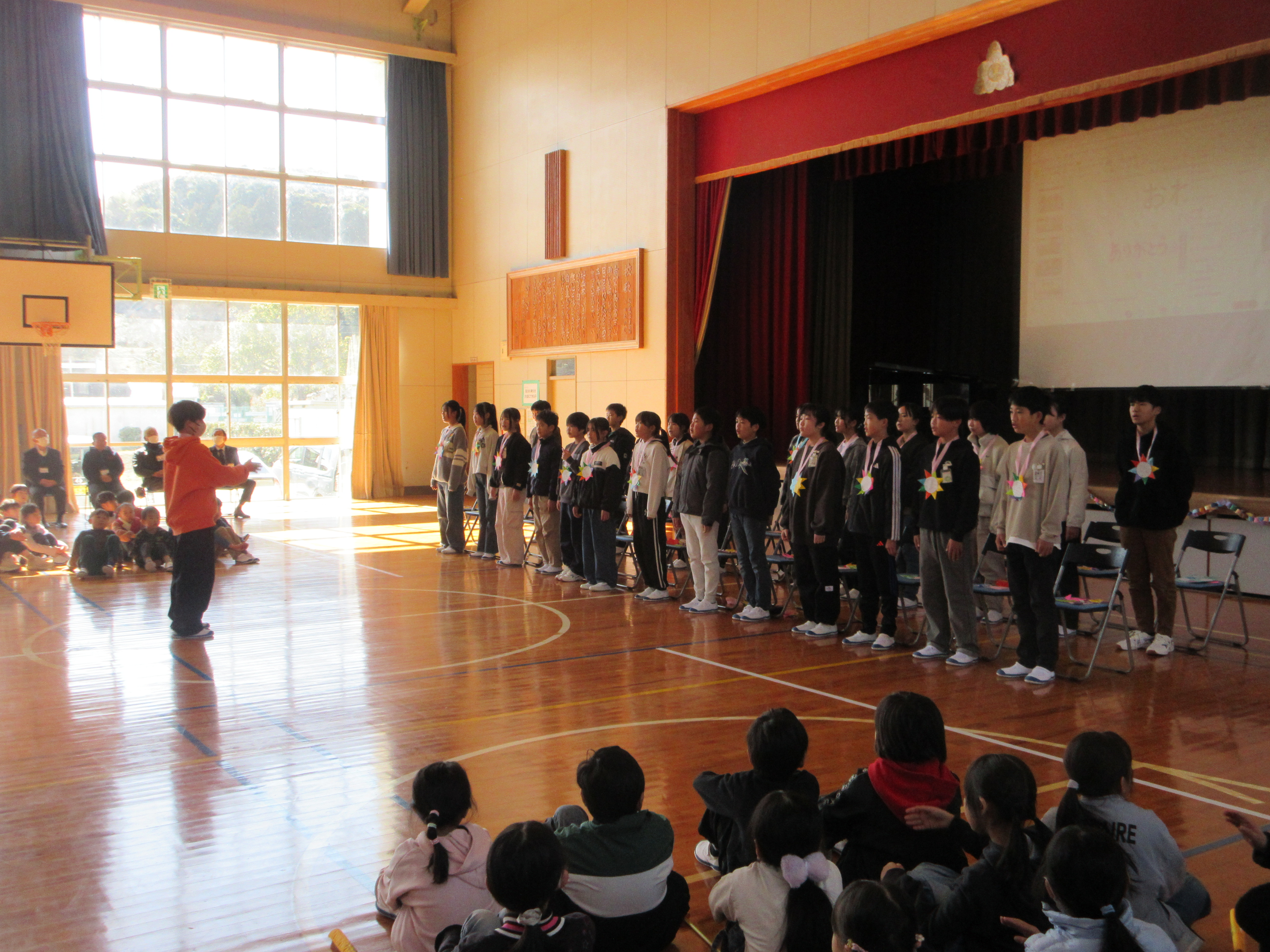 「6年生ありがとうの会」を行いました。学校運営協議会委員の皆様、保護者のみなさんも御参加いただきありがとうございます。6年生に感謝の気持ちを伝えようと、5年生が中心となり企画・運営、各学年の出し物やプレゼント、スライドショーなどを行いました。どの学年もアイデアいっぱい、6年生一人一人に思い出のエピソード・メッセージを伝えたり、歌やおどり・クイズなど、温かい気持ちでいっぱい。思い出のスライドでは、6年生のこれまでの写真が次々に出され、なつかしがる6年生。最後は、6年生からメッセージと歌、そして全校みんなで一緒にゲームをしてくれました。1時間の会があっという間で、とっても心があたたまる素敵な会となりました。